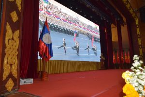 ໃນພິທີຄັ້ງນີ້ ໄດ້ຮັບຊົມການຖ່າຍທອດສົດ ພິທີໂຮມຊຸມນຸມໃຫ່ຍ ການເດີນສວນສະໜາມທີ່ທາງສູນກາງໄດ້ຈັດຂື້ນຢ່າງຍິ່ງໃຫ່ຍທີ່ນະຄອນຫລວງວຽງຈັນພ້ອມທັງຮັບຟັງປະທານປະເທດ ກ່າວສູນທອນພົດ ວັນສະຖາປານາ ສາທາລະນະລັດ ປະຊາທິປະໄຕ ປະຊາຊົນລາວ ຄົບຮອບ 50 ປີ ກ່ອນໜ້ານີ້ 50 ປີ, ນະສະຖານທີ່ນີ້ ໄດ້ເປັນບ່ອນເຕົ້າໂຮມກ້ອນກໍາລັງອັນມະຫຶມາ ຂອງນັກປະຕິວັດ ແລະ ປະຊາຊົນລາວຜູ້ຮັກຊາດ ເພື່ອຍຶດອໍານາດການປົກຄອງ ຢູ່ນະຄອນຫຼວງວຽງຈັນ, ອັນນໍາໄປສູ່ກອງປະຊຸມໃຫຍ່ຜູ້ແທນປະຊາຊົນທົ່ວປະເທດ ເພື່ອປະກາດລົບລ້າງລະບອບລ່າເມືອງຂື້ນ ແລະ ສັກດີນາ, ຂຸນເສິກ ຢ່າງສິ້ນເຊີງ, ສະຖາປະນາ ສາທາລະນະລັດ ປະຊາທິປະໄຕປະຊາຊົນລາວ ຂື້ນຢ່າງສະຫງ່າຜ່າເຜີຍ ໃນວັນທີ 2 ທັນວາ 1975. ຈາກເຫດການປະຫວັດ ສາດອັນຍິ່ງໃຫຍ່ຄັ້ງນີ້ “ໄດ້ເຮັດໃຫ້ຊາຕາກໍາ ຂອງຊາດ ແລະ ສັງຄົມ ປະເທດເຮົາປ່ຽນແປງຢ່າງເລິກເຊິ່ງ ແລະ ໄດ້ໄຂສັງກາດ ໃໝ່ແຫ່ງການກໍ່ສ້າງປິຕຸພູມລາວ ທີ່ແສນຮັກ ແລະ ຫວງແຫນ ຂອງພວກເຮົາໃຫ້ກ້າວເດີນໄປຢ່າງວ່ອງໄວ ແລະ ເຂັ້ມແຂງ ຕາມເສັ້ນທາງເອກະລາດ, ເປັນເຈົ້າຕົນເອງ, ເອກະພາບ ແລະ ວັດທະນະຖາວອນ,ຮັບປະກັນໃຫ້ປະຊາຊົນລາວ ບັນດາເຜົ່າ ໄດ້ດໍາລົງຊີວິດຢູ່ ຢ່າງອີ່ມໜໍາສໍາລານ, ມີອິດສະຫຼະພາບ ແລະ ມີຄວາມຜາສຸກ ຕະຫຼອດກາລະນານ”. ເມື່ອຫວນຄືນ ວັນແຫ່ງໄຊຊະນະອັນຍິ່ງໃຫຍ່ ແຫ່ງການສ້າງຕັ້ງລະບອບໃໝ່ ທີ່ດັງກ້ອງກັງວານໄປທົ່ວທຸກແຫ່ງຫົນໃນທົ່ວປະເທດ ແລະ ທົ່ວໂລກນັ້ນ ພວກເຮົາ ມີຄວາມອາໄລອາວອນ ແລະ ຮູ້ບຸນຄຸນອັນໃຫຍ່ຫຼວງ ຕໍ່ວິລະກໍາອັນລໍ້າເລີດ, ລະນຶກເຖິງຜົນງານ ແລະ ການເສຍສະຫຼະອັນຍິ່ງໃຫຍ່ ຂອງປະທານ ໄກສອນ ພົມວິຫານ, ປະທານ ສຸພານຸວົງ ແລະ ບັນດາຜູ້ນໍາ, ນັກຮົບປະຕິວັດ, ວິລະຊົນ, ສະມາຊິກພັກ-ພະນັກງານ ຕະຫຼອດຮອດປະຊາຊົນລາວບັນດາເຜົ່າ ທີ່ໄດ້ອຸທິດໃຫ້ແກ່ພາລະກິດຕໍ່ສູ້ກູ້ຊາດ ຢ່າງພິລະອາດຫານ, ບໍ່ຢ້ານກົວຕໍ່ຄວາມຫຍຸ້ງຍາກ ລໍາບາກໃດໆ ຈົນສາມາດຍາດໄດ້ເອກະ ລາດແຫ່ງຊາດ ແລະ ປົດປ່ອຍ ປະເທດຊາດ ໄດ້ຢ່າງສົມບູນ ດ້ວຍສາມບາດຄ້ອນຍຸດທະສາດ ແບບບົວບໍ່ຊໍ້ານໍ້າບໍ່ຂຸ່ນ ແຕ່ສາມາດຈັບປາໄດ້.